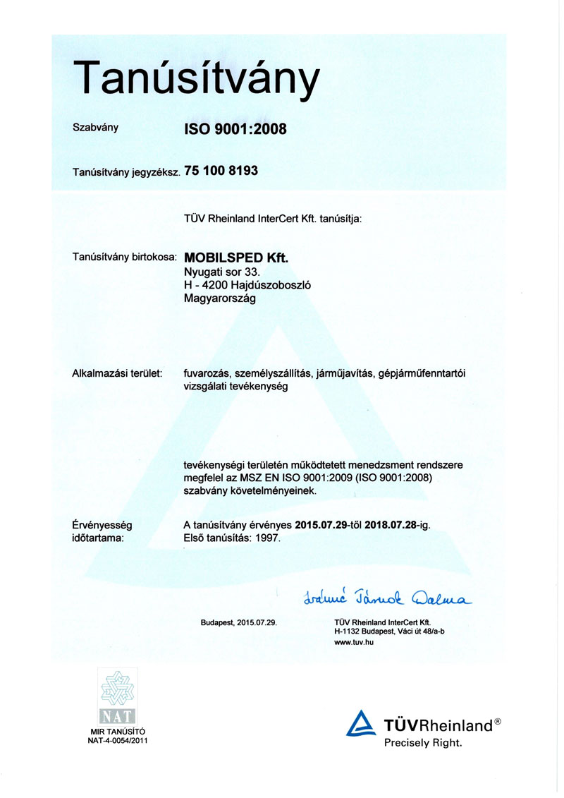 Minőségirányítási tevékenységünk alapja a tanúsító szervezet által tanúsításra kerülő és folyamatosan felügyelt MSZ EN ISO 9001:2009 szabvány és mindenkori közlekedési hatóság szerinti követelményeknek megfelelően működő minőségirányítási rendszer.